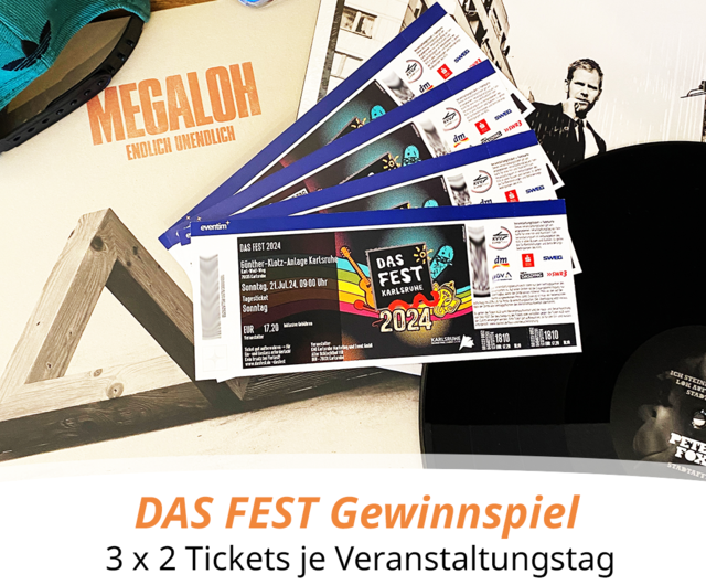 Schreiben Sie eine Mail mit dem Betreff “DAS FEST 2024” und Ihren beiden Antworten, Ihrer Teilnehmernummer und für welchen Tag Sie gerne Tickets gewinnen möchten bis Freitag, den 12.07.2024 um 12 Uhr an marketing(at)karlsruhe.stadtmobil.de.